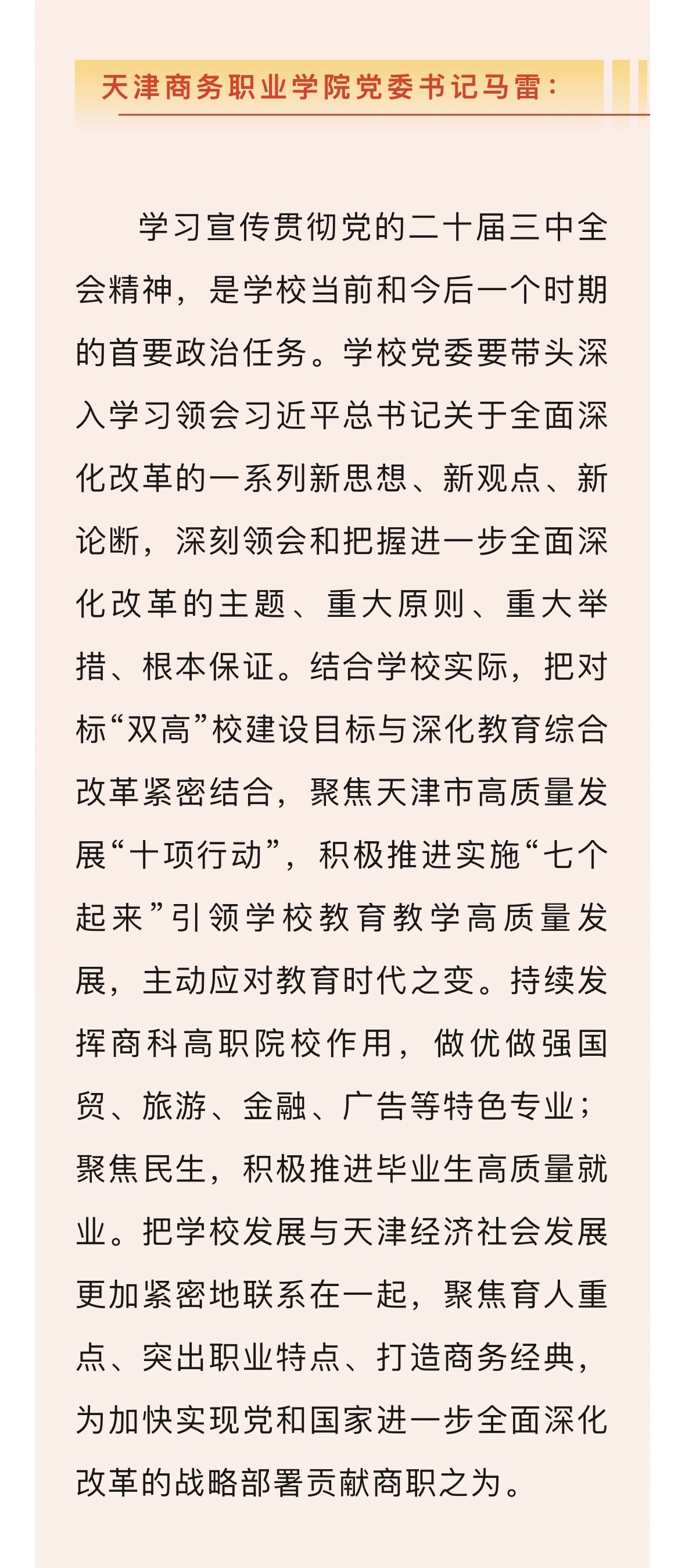 學(xué)習(xí)宣傳貫徹黨的二十屆三中全會(huì)精神,是學(xué)校當(dāng)前和今后一個(gè)時(shí)期的首要政治任務(wù)。學(xué)校黨委要帶頭深入學(xué)習(xí)領(lǐng)會(huì)習(xí)近平總書(shū)記關(guān)于全面深化改革的一系列新思想、新觀點(diǎn)、新論斷,深刻領(lǐng)會(huì)和把握進(jìn)一步全面深化改革的主題、重大原則、重大舉措、根本保證。結(jié)合學(xué)校實(shí)際,把對(duì)標(biāo)“雙高”校建設(shè)目標(biāo)與深化教育綜合改革緊密結(jié)合,聚焦天津市高質(zhì)量發(fā)展“十項(xiàng)行動(dòng)”,積極推進(jìn)實(shí)施“七個(gè)起來(lái)”引領(lǐng)學(xué)校教育教學(xué)高質(zhì)量發(fā)展,主動(dòng)應(yīng)對(duì)教育時(shí)代之變。持續(xù)發(fā)揮商科高職院校作用,做優(yōu)做強(qiáng)國(guó)貿(mào)、旅游、金融、廣告等特色專業(yè);聚焦民生,積極推進(jìn)畢業(yè)生高質(zhì)量就業(yè)。把學(xué)校發(fā)展與天津經(jīng)濟(jì)社會(huì)發(fā)展更加緊密地聯(lián)系在一起,聚焦育人重點(diǎn)、突出職業(yè)特點(diǎn)、打造商務(wù)經(jīng)典,為加快實(shí)現(xiàn)黨和國(guó)家進(jìn)一步全面深化改革的戰(zhàn)略部署貢獻(xiàn)商職之為。