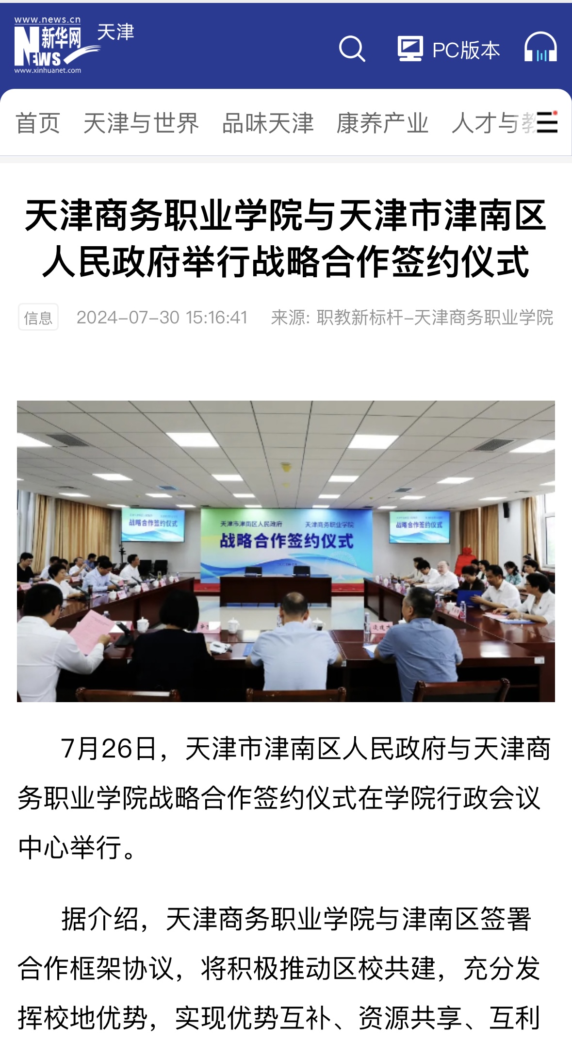 媒體關注 | 【新華網】天津商務職業學院與天津市津南區人民政府舉行戰略合作簽約儀式