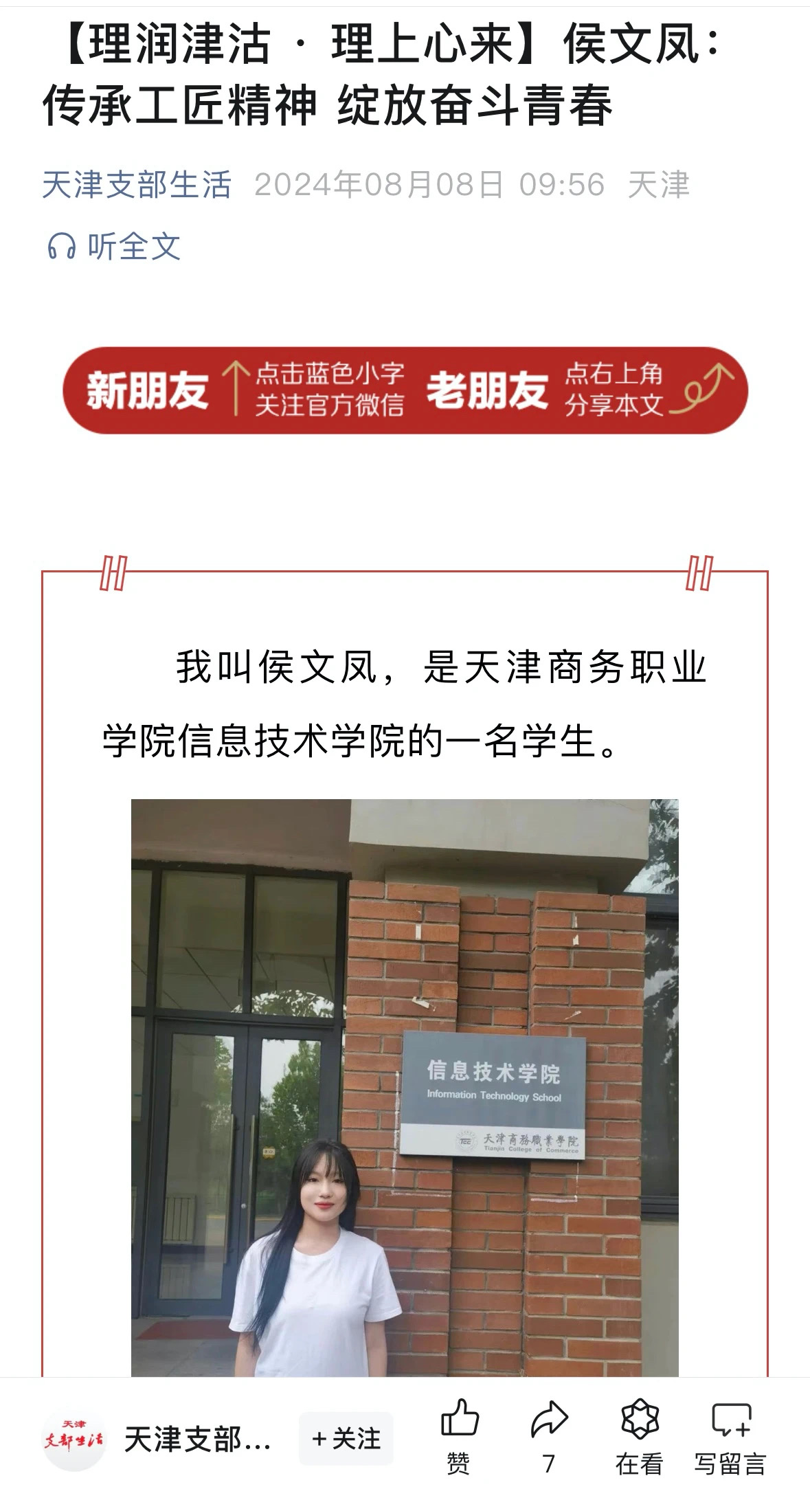 我叫侯文鳳,是天津商務職業學院信息技術學院的一名學生。