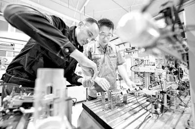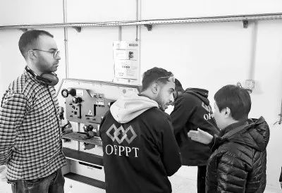 在摩洛哥魯班工坊,天津商務職業學院教師(右一)指導外方團隊開展設備實操。作者供圖