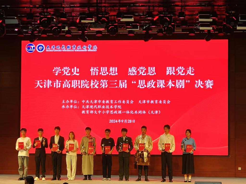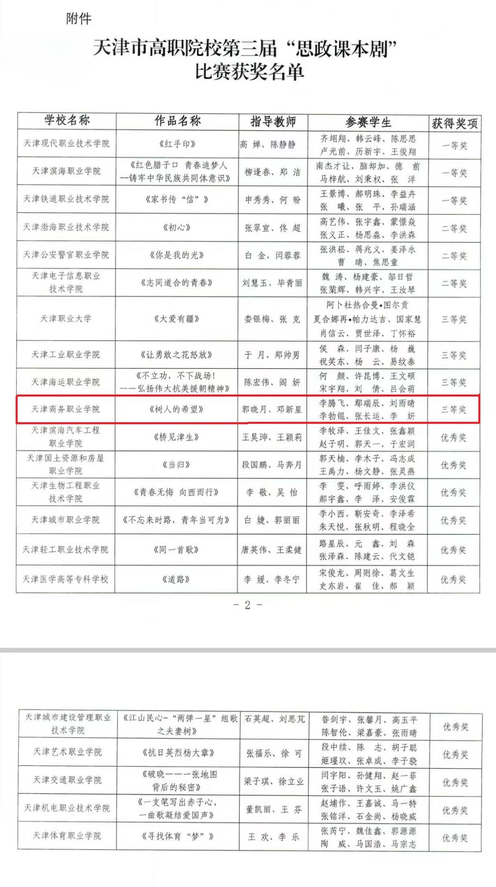 近日,我校馬克思主義學(xué)院郭曉月、鄧新星兩位老師指導(dǎo)國際貿(mào)易學(xué)院李騰飛、鄢瑞辰、劉雨晴、李勃錕、張長運(yùn)、李妍6名同學(xué)編演的原創(chuàng)劇目《樹人的希望》榮獲天津市高職院校第三屆“思政課本劇”比賽三等獎(jiǎng)。