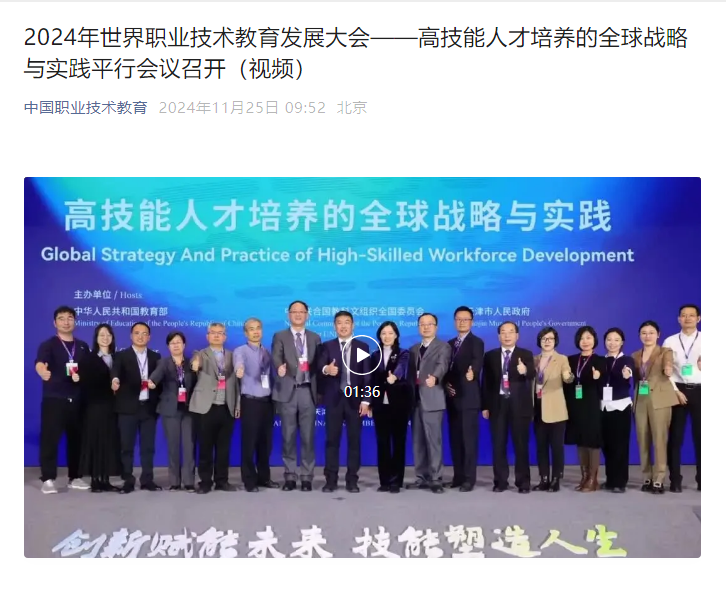 媒體關注 | 【中國職業技術教育】2024年世界職業技術教育發展大會——高技能人才培養的全球戰略與實踐平行會議召開(視頻)
