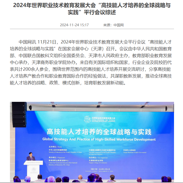 媒體關(guān)注 | 【中國(guó)網(wǎng)】報(bào)道我校協(xié)辦的2024年世界職業(yè)技術(shù)教育發(fā)展大會(huì)“高技能人才培養(yǎng)的全球戰(zhàn)略與實(shí)踐”平行會(huì)議綜述