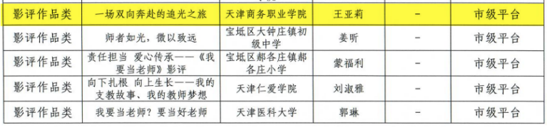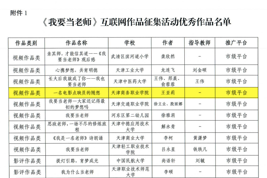近日,天津市教育兩委公布了電影《我要當老師》相關互聯(lián)網作品征集活動獲獎名單。我校馬克思主義學院王亞莉老師的原創(chuàng)視頻作品《一名電影點映員的隨想》和影評作品《一場雙向奔赴的追光之旅》均獲得市級獎項。