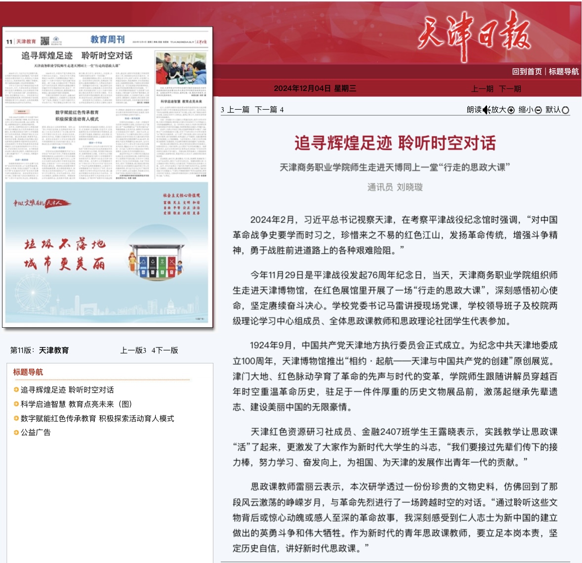 媒體關注 | 【天津日報】追尋輝煌足跡 聆聽時空對話 天津商務職業學院師生走進天博同上一堂“行走的思政大課”