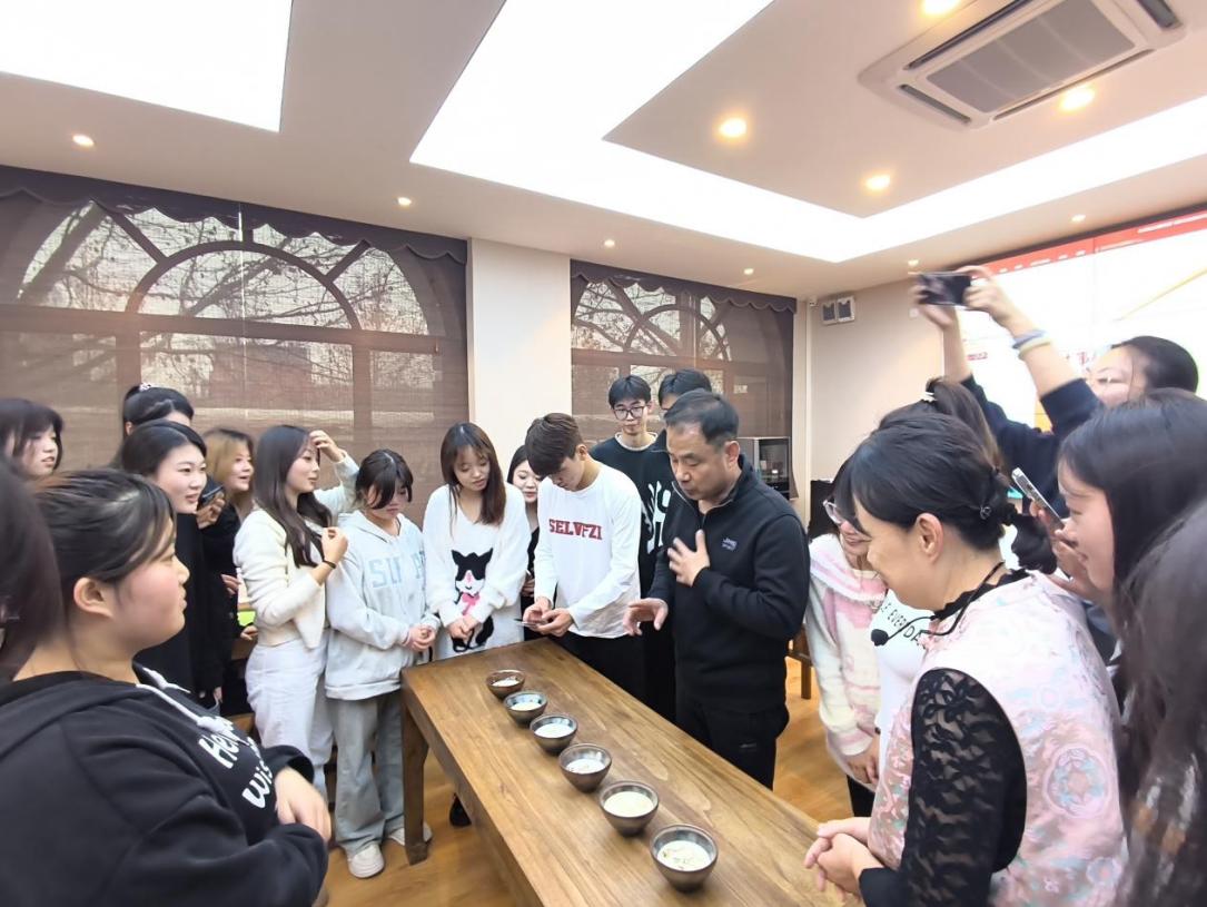 楊冠聲副校長走進殷哲浩老師的《茶文化概論》課堂,與同學們一起參與宋代點茶的實踐教學,了解了宋代點茶的歷史背景、點茶的器物、點茶的技藝等,親身體驗了宋代斗茶的教學環節,并對授課教師的講授給與高度評價,對學生實踐教學成果給與肯定。