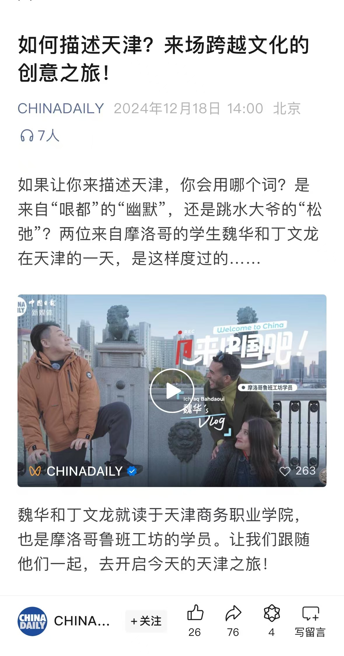 魏華和丁文龍就讀于天津商務職業學院,也是摩洛哥魯班工坊的學員。讓我們跟隨他們一起,去開啟今天的天津之旅!