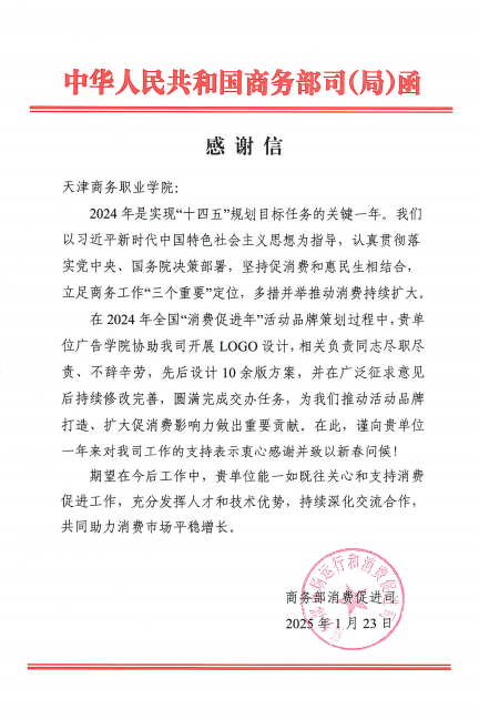 近日,商務部消費促進司致函天津商務職業學院,對學院所屬廣告學院在2024年全國“消費促進年”活動品牌策劃中提供的大力支持表示衷心感謝,并致以新春問候。
