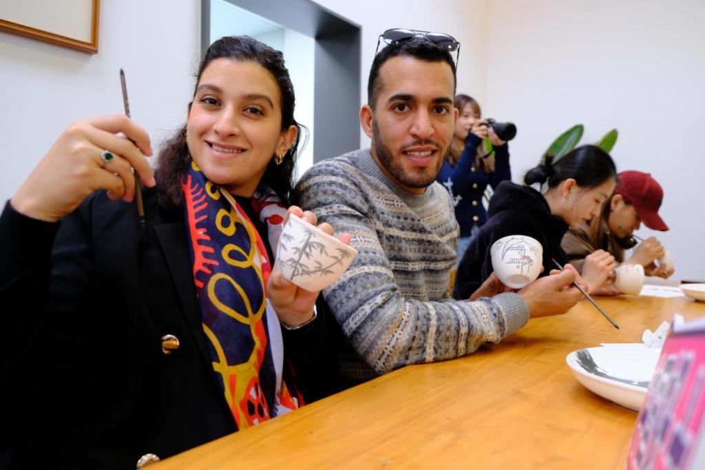 作為天津市級(jí)非遺項(xiàng)目陳氏制瓷(手繪)制作技藝的傳承和保護(hù)單位,觀照軒展示了豐富的瓷器文化和精湛的制瓷工藝。國(guó)際學(xué)生們?cè)诮橙说闹笇?dǎo)下,親手繪制瓷器,體驗(yàn)了從調(diào)色、構(gòu)圖到上釉的完整制瓷流程。我校4名摩洛哥學(xué)生對(duì)瓷器的細(xì)膩紋理和中華文化內(nèi)涵贊不絕口。他們紛紛表示:“每一件瓷器都承載著匠人的智慧與心血,讓人深刻感受到中國(guó)文化的深厚底蘊(yùn)”“今年是學(xué)校70周年校慶,我要把我做的瓷器作為禮物獻(xiàn)給學(xué)校”。
