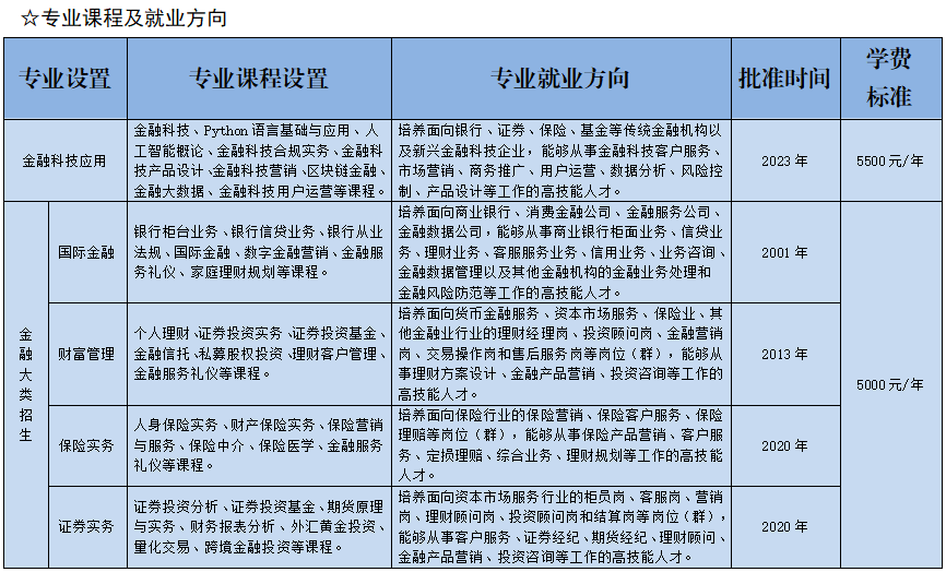 國際金融、財富管理、保險實務、證券實務專業在專業目錄中均屬于5302金融類,特點是專業基礎相同、行業細分明確,適合“強化基礎、因材施教、分流培養、凸顯特色”的大類招生模式。通過大類招生能夠糾正考生的專業認知偏差,有效激發學生學習動力,促進教育鏈、人才鏈與產業鏈、創新鏈有效銜接。