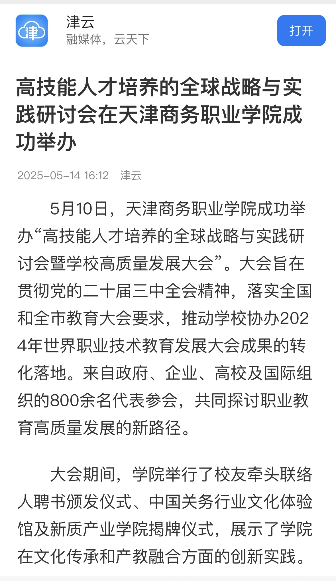 5月10日,天津商務(wù)職業(yè)學院成功舉辦“高技能人才培養(yǎng)的全球戰(zhàn)略與實踐研討會暨學校高質(zhì)量發(fā)展大會”。大會旨在貫徹黨的二十屆三中全會精神,落實全國和全市教育大會要求,推動學校協(xié)辦2024年世界職業(yè)技術(shù)教育發(fā)展大會成果的轉(zhuǎn)化落地。來自政府、企業(yè)、高校及國際組織的800余名代表參會,共同探討職業(yè)教育高質(zhì)量發(fā)展的新路徑。