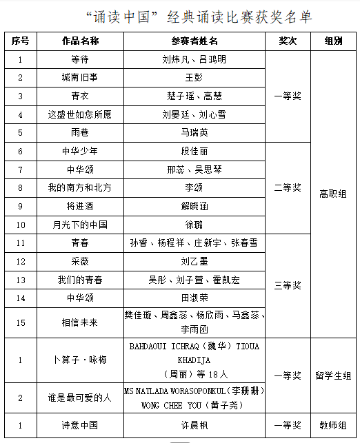 為進一步提升參賽作品的水平,5月30日,學(xué)校特邀請了天津市“聲動領(lǐng)誦團,經(jīng)典誦讀進校園”項目發(fā)起人、天津市教育科學(xué)院國家級普通話測試員葉紅梅老師對“誦讀中國”賽項一等獎作品從作品的誦讀技巧、情感表達、舞臺表現(xiàn)等方面進行了專業(yè)指導(dǎo),讓參賽選手們受益匪淺。根據(jù)作品質(zhì)量和特色,最終從“誦讀中國”賽項各賽道一等獎獲獎作品中推選了高職組《等待》、教師組《詩意中國》、留學(xué)生組《卜算子?詠梅》三個作品參加相應(yīng)賽項市賽比賽。“詩教中國”賽項則根據(jù)作品綜合得分,推選前五名作品參加相應(yīng)賽項市賽。根據(jù)相關(guān)文件要求,“印記中國”和“書寫中國”參賽選手自行申報相應(yīng)賽項的市賽和國賽,不做限額。
