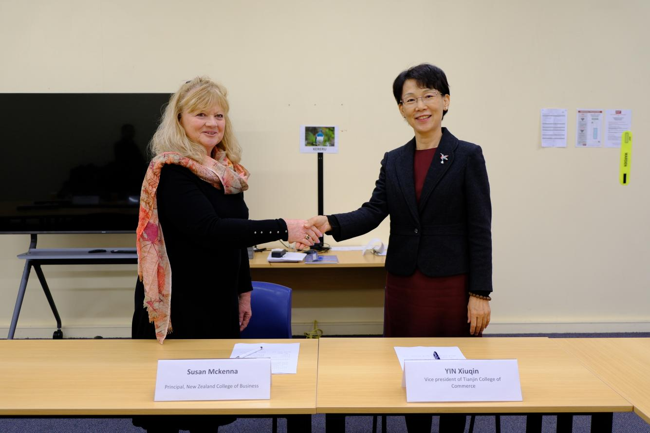 副校長尹秀琴代表學校與新西蘭商學院校長蘇珊·麥肯娜簽署合作協議