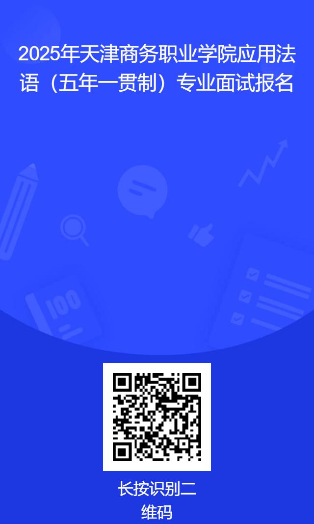 我校應用法語(五年一貫制)專業面向參加天津市初中學業水平考試的考生進行招生,凡有意愿報考該專業的考生,請掃描下方二維碼填寫相關信息報名參加我校面試,面試合格后方可填報我校該專業志愿。報名從本須知公布之日起到2025年7月6日16:00結束。