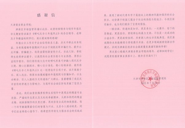 津南區質監局在感謝信中特別提到,該視頻以獨特創意和精良制作吸引了廣泛關注,不僅有效推動了年報宣傳與反詐知識普及,更在維護市場秩序、守護群眾財產安全方面發揮了積極作用。質監局高度肯定學院的專業水準與社會責任感,期待未來深化合作,共同為津南區發展賦能。
