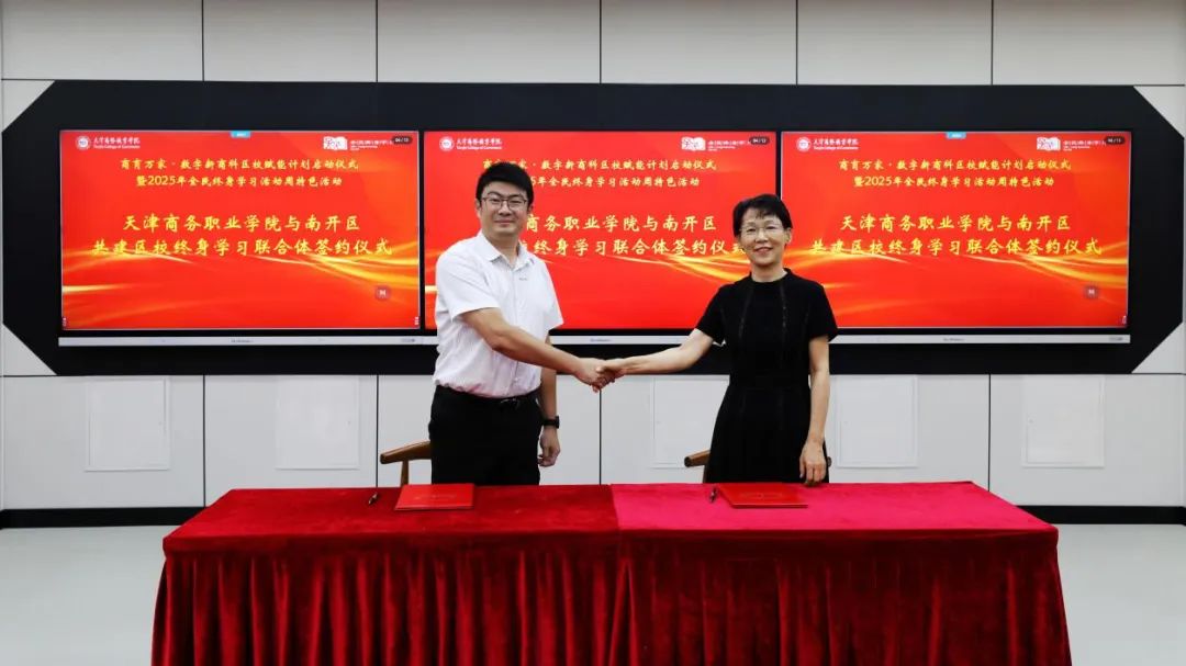 隨后,天津商務職業學院與南開區正式簽署共建“區校終身學習聯合體”協議,標志著雙方將在三教協同、社老融合、“雙周”活動等領域深度合作,探索區校聯動新模式。