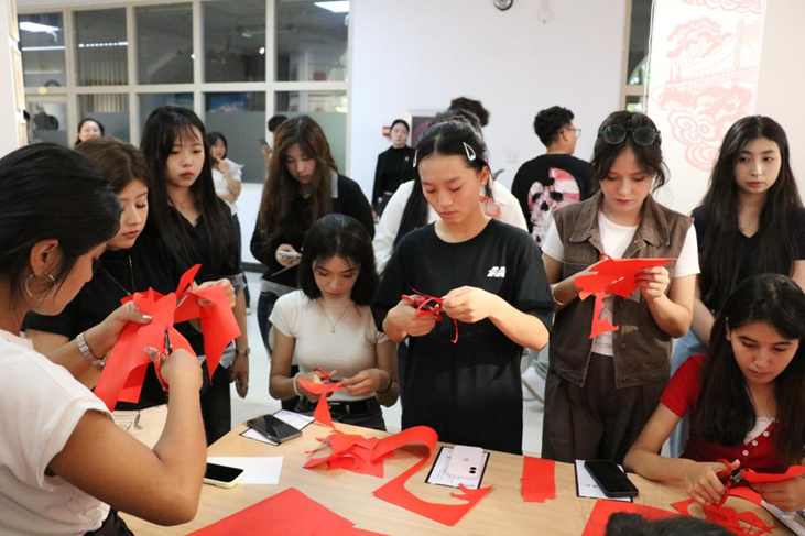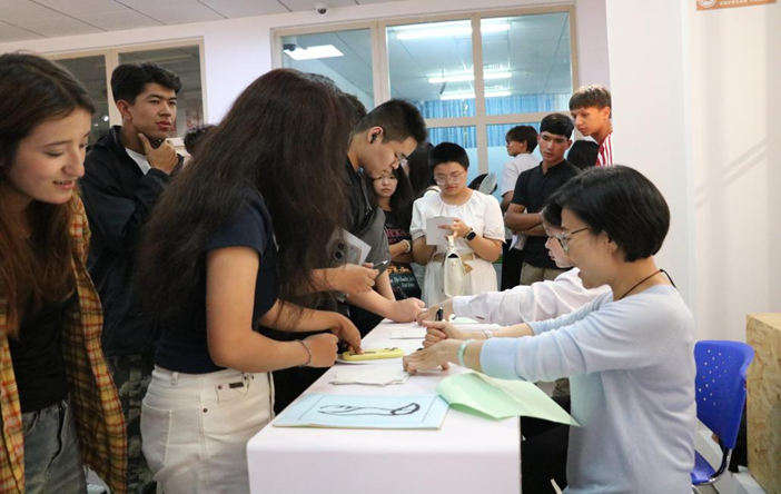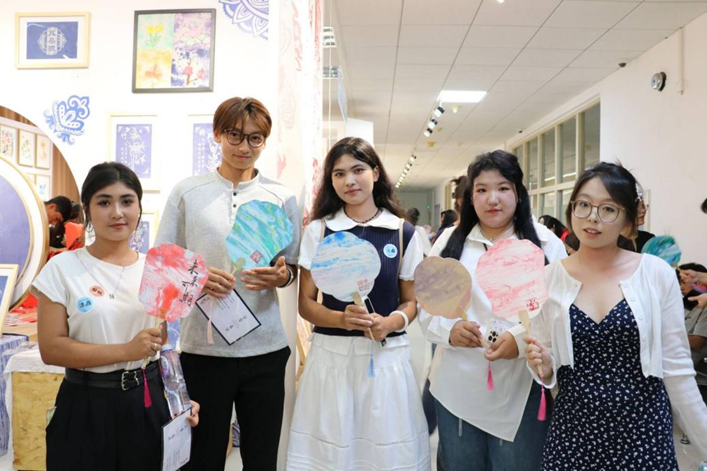 在美育教師和學生志愿者的指導下,同學們手拿紙扇伸入染色器皿,剎那間就在紙扇上染制出各色山水圖樣。然后,同學們或用毛筆題寫“語通中華”“同心筑夢”等寄語,或加蓋印有“厚德尚能”“勵學弘商”校訓的篆刻圖章。拿著自己親手染制的精美絕倫的畫扇,會計學院藏族學生邊巴普尺激動地說:“看著一幅幅山水紋樣在扇面上慢慢呈現,同學們親手寫下寄語,蓋上印有校訓的篆刻圖章,我真切感受到中華優秀傳統文化是各民族共同的財富,增加了對祖國與學校的熱愛。”