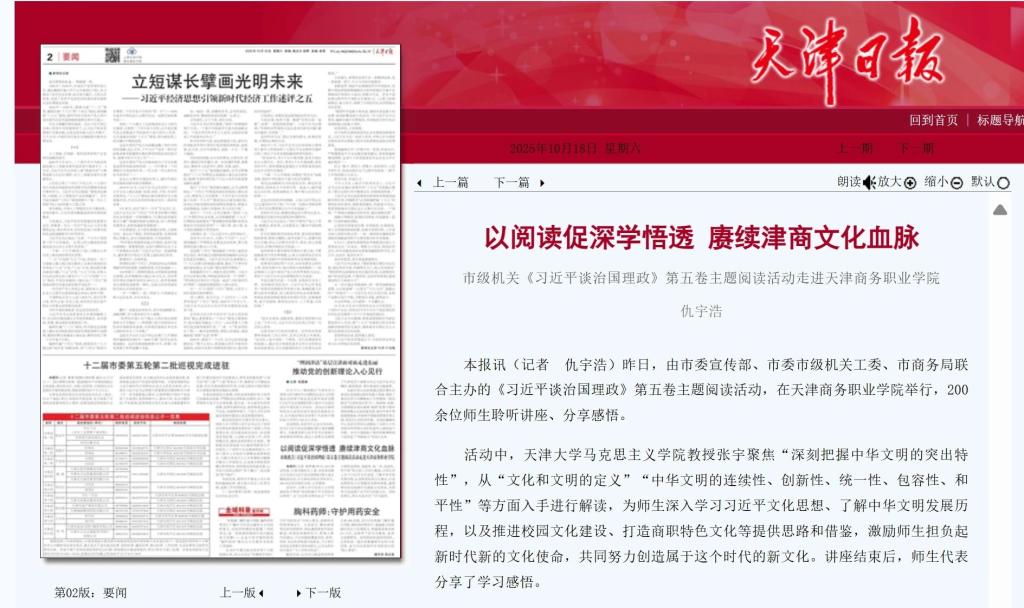 本報訊(記者 仇宇浩)昨日,由市委宣傳部、市委市級機關工委、市商務局聯合主辦的《習近平談治國理政》第五卷主題閱讀活動,在天津商務職業學院舉行,200余位師生聆聽講座、分享感悟。