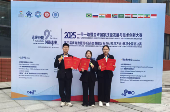 為深入貫徹《國家職業(yè)教育改革實施方案》中“強化學生實踐能力和可持續(xù)發(fā)展能力培養(yǎng)”的要求,落實職業(yè)教育“以賽促學、以賽促教、以賽促改”核心導向,學校始終將高水平賽事作為錘煉學子專業(yè)本領的重要舞臺。近日,2025“一帶一路”暨金磚國家技能發(fā)展與技術創(chuàng)新大賽之第三屆商務數(shù)據(jù)分析(商務數(shù)據(jù)分析與AI應用方向)賽項全國總決賽落幕,我校商務數(shù)據(jù)分析與應用專業(yè)參賽團隊從全國眾多精英隊伍中突圍,成功斬獲高職組一等獎(金牌),指導教師張爽、周東朝獲評“優(yōu)秀指導教師”,學校榮獲“最佳組織獎”,用實力彰顯職教育人成效!