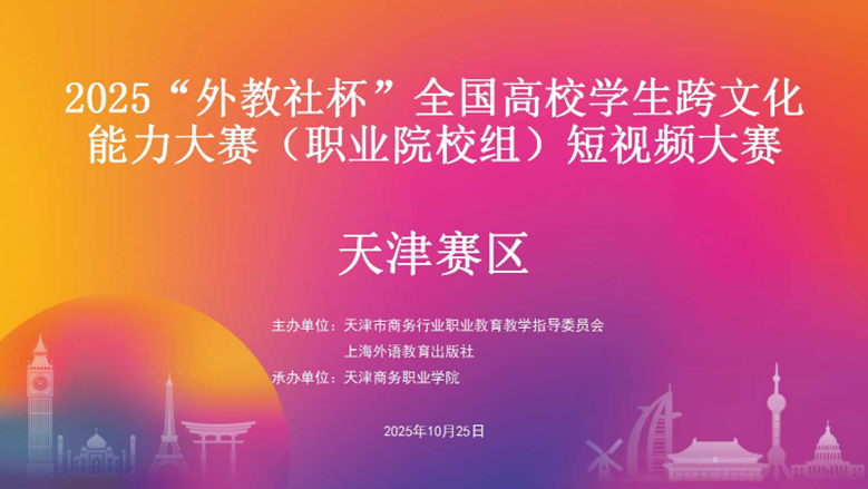10月25日,由天津市商務行業職業教育教學指導委員會與上海外語教育出版社聯合主辦、學校公共外語教學部承辦的2025年“外教社杯”全國高校學生跨文化能力大賽(職業院校組)短視頻大賽落下帷幕。大賽以“堅定文化自信,增進國際理解”為主題,旨在以賽促學,鼓勵高職學子以短視頻形式講述中國故事,傳播中國聲音,展現新時代青年跨文化傳播能力。