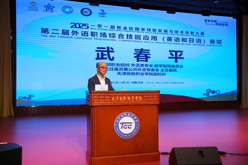 天津商務職業學院副校長武春平代表學校致閉幕詞,他表示承辦此次大賽,是對學校辦學實力、組織協調能力的一次全面檢驗,希望通過大賽,進一步激發廣大青年學習外語、鉆研技能的熱情,引導外語教學更加貼近行業需求、聚焦實際應用,培養出更多既精通外語又熟悉業務、既具備國際視野又深諳本土實踐的高技能人才,為“一帶一路”建設和金磚國家合作走深走實提供堅實的人才支撐。