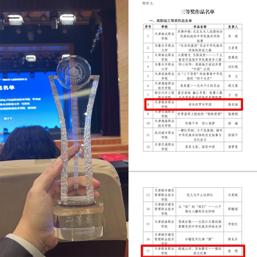 本次大賽是跨區域、高規格的思政課教學領域專業賽事,來自天津、新疆、山東、河北等地的多所高職院校參賽團隊圍繞“鑄牢中華民族共同體意識”這一主題,開展切磋交流。馬克思主義學院高度重視此次備賽工作,將其作為提升教師授課能力和課程教學質量的重要契機,以“新老攜手、以賽促教”的組隊思路,鼓勵參賽教師結合自身專業背景設計參賽作品,并通過集體教研會,從教學設計、案例展示等多方面對參賽作品進行全方位打磨,確保參賽作品教學設計精巧、教學案例鮮活,既有理論深度又具情感溫度。最終,學校選送的三項參賽作品全部進入決賽,分獲大賽二、三等獎。