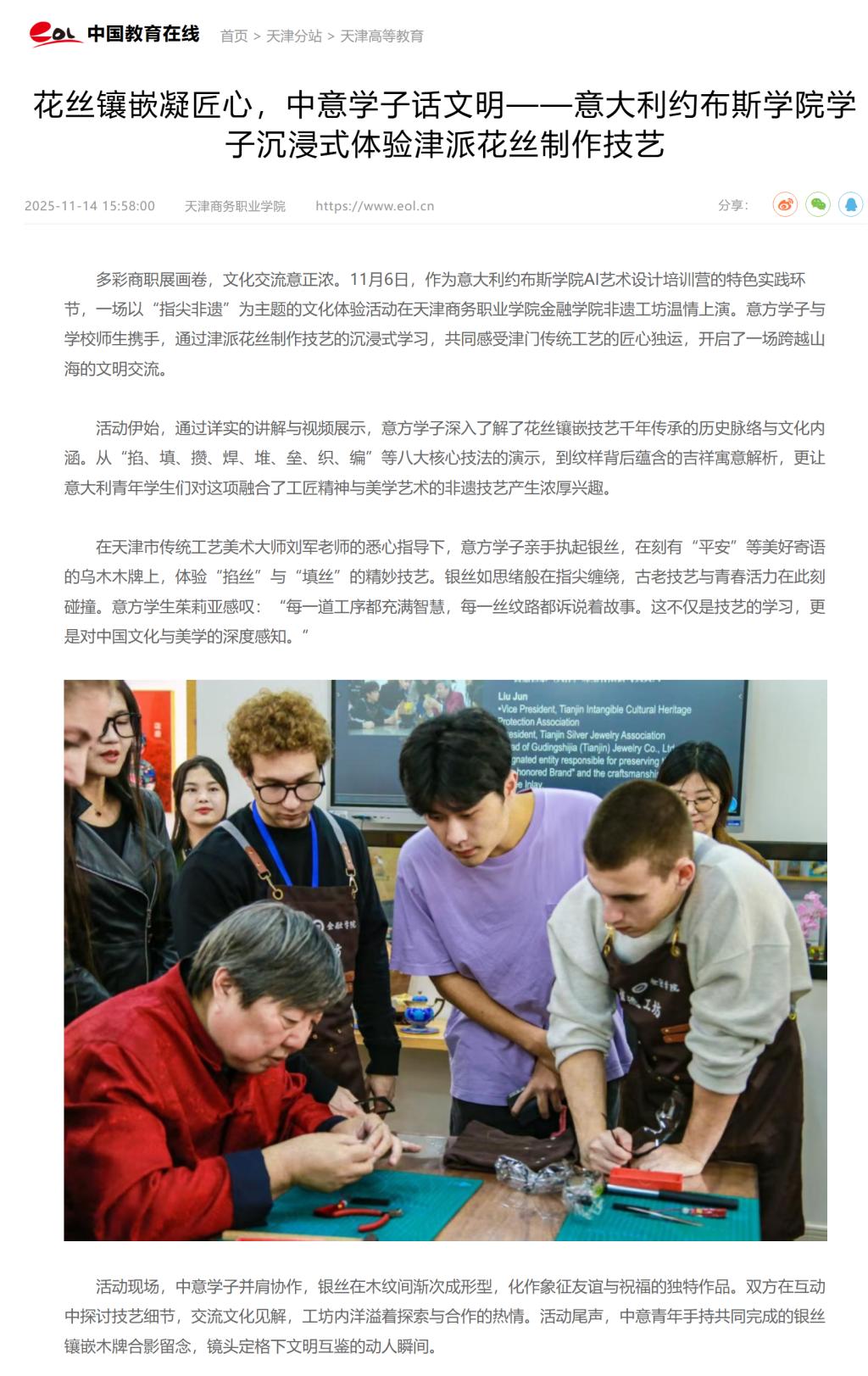 媒體關注 | 中國教育在線報道我校花絲鑲嵌凝匠心,中意學子話文明——意大利約布斯學院學子沉浸式體驗津派花絲制作技藝
