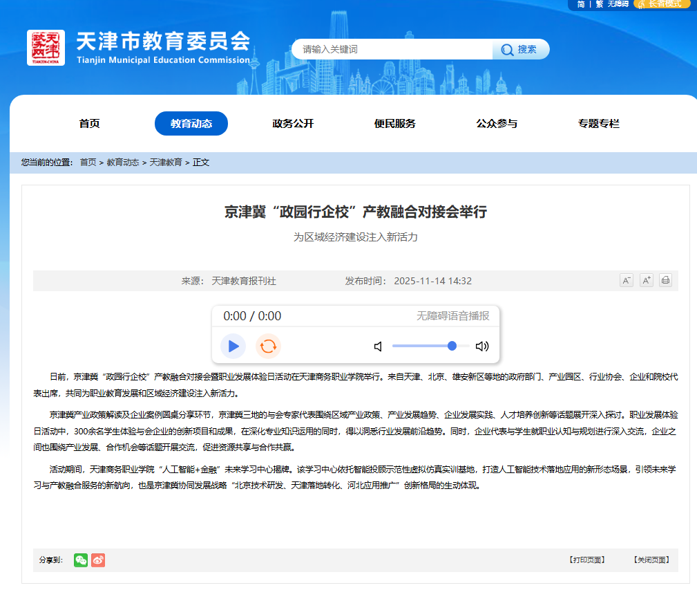 日前,京津冀“政園行企校”產(chǎn)教融合對接會暨職業(yè)發(fā)展體驗日活動在天津商務(wù)職業(yè)學(xué)院舉行。來自天津、北京、雄安新區(qū)等地的政府部門、產(chǎn)業(yè)園區(qū)、行業(yè)協(xié)會、企業(yè)和院校代表出席,共同為職業(yè)教育發(fā)展和區(qū)域經(jīng)濟建設(shè)注入新活力。