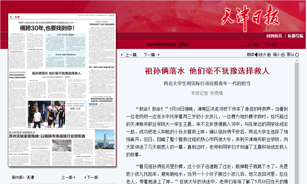 5月26日《天津日?qǐng)?bào)》第5版“天津”以“祖孫倆落水 他們毫不猶豫選擇救人”為題,刊發(fā)我校王晨和徐成宏兩位大一學(xué)生勇救落水兒童和老人的義舉,鼓勵(lì)見義勇為精神,大力宣傳當(dāng)代青年向上向善的精神風(fēng)貌和智慧勇敢的優(yōu)秀品質(zhì),弘揚(yáng)社會(huì)正氣。