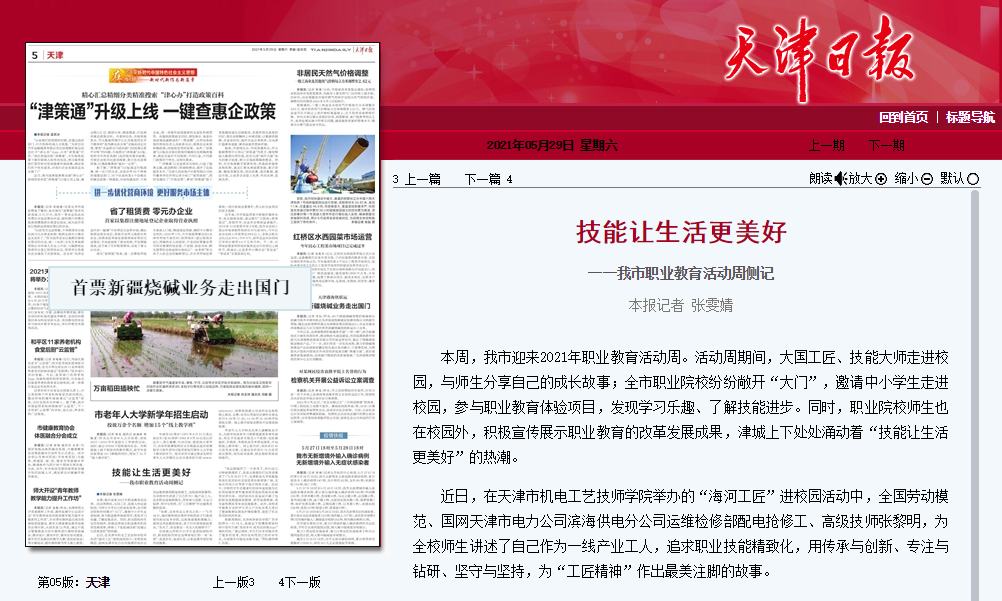 05月29日《天津日報》第5版“天津”以《技能讓生活更美好——我市職業教育活動周側記》為題,報道各職業院校紛紛敞開“大門”,宣傳展示職業教育的改革發展成果,其中提及我校積極參與職業教育體驗項目,廣告學院師生赴薊縣鄉村開展“美麗鄉村 我為民宿做logo”調研活動。
