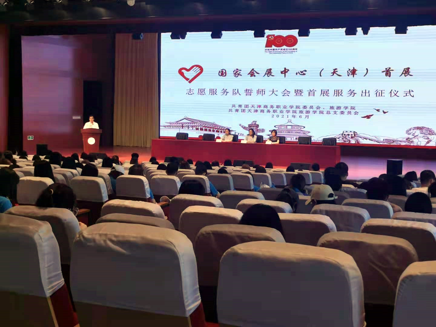 為進(jìn)一步提振志愿者精神,堅(jiān)定志愿者的責(zé)任感與使命感,增強(qiáng)團(tuán)隊(duì)的凝聚力和戰(zhàn)斗力,以高水平的志愿服務(wù)、良好的精神面貌、真誠地志愿行動,為國家會展中心啟用暨綠色智慧建筑博覽會提供最優(yōu)質(zhì)的志愿服務(wù),2021年6月21日,學(xué)校團(tuán)委在行政中心報告廳舉行國家會展中心(天津)首展志愿服務(wù)隊(duì)誓師大會暨首展服務(wù)出征儀式,校團(tuán)委、旅游學(xué)院部分老師和186名青年志愿者參加此次活動。