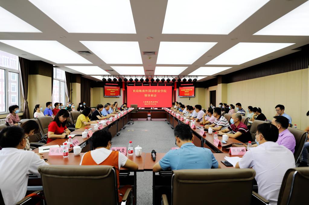 7月13日下午,海南外國語職業學院黨委書記佴建喬、副院長楊學前等一行46人到我校交流訪問。黨委書記宮寶利、副校長武春平出席座談會,組織部、教務處、學生處、國貿學院、外語學院等部門負責人參加交流。