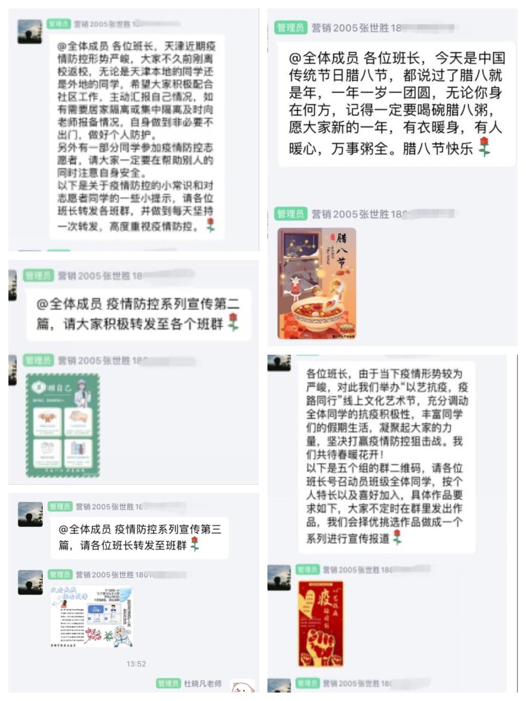 線下,老師和同學們積極響應號召,到社區(村)報到,成為疫情防控志愿者,積極投身疫情防控一線工作。物流2002王再興、馮康裕,營銷2005周婧勖,物流2102魏雪、翟娜、營銷三二2101張雅淇、趙家宇等,在津同學積極投身疫情防控服務;外省市同學也不甘示弱,營銷2001張雪穎,營銷2003趙文瑄,電商2102張冰冰等同學積極參與家鄉防疫工作,協助社區工作人員對居住的小區住戶進行摸排,為來往人員監測體溫并做登記。