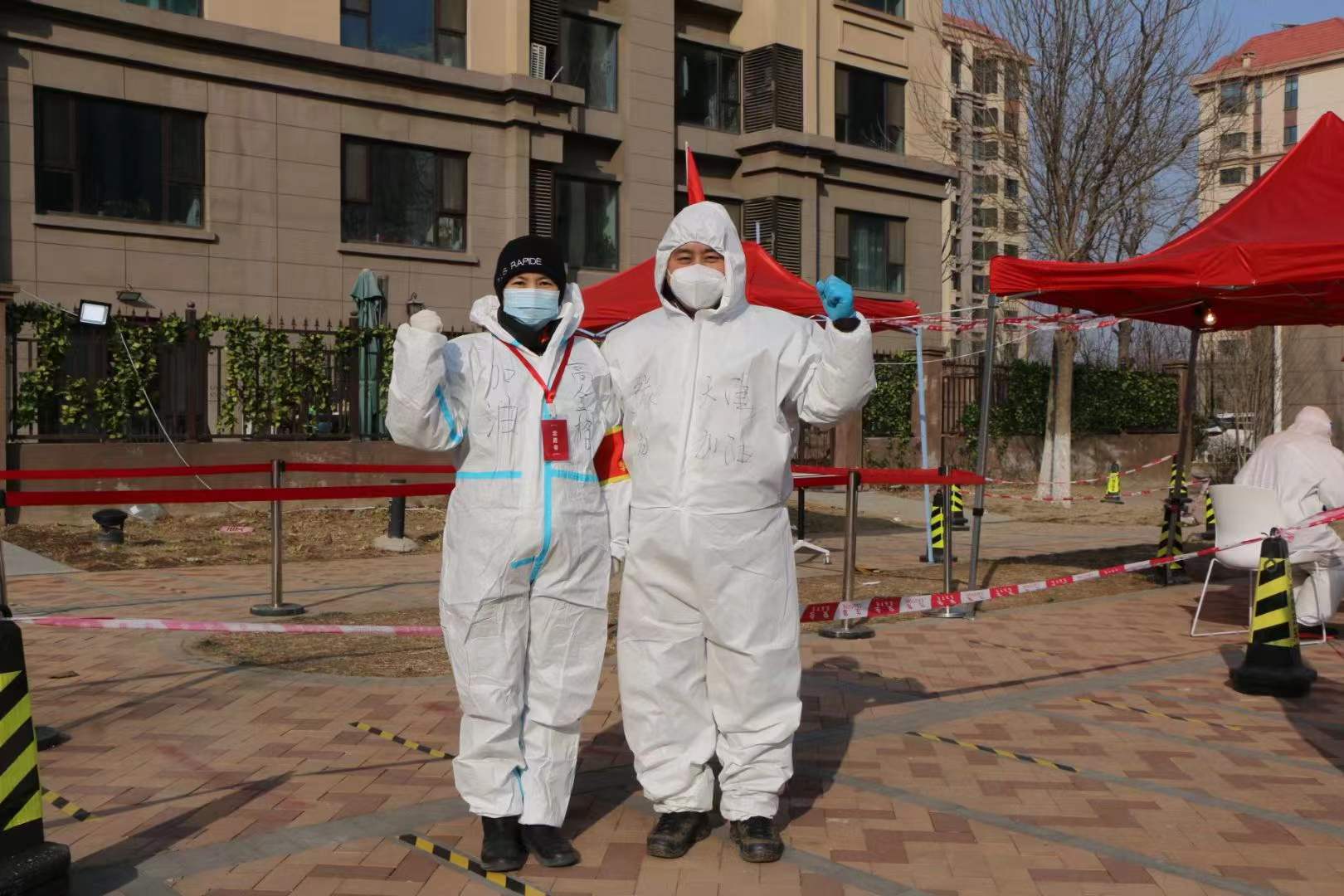 體育教學部高金格老師家住津南,愛人是民警,首批下沉,高老師也“不甘示弱”,主動到社區報到,作為志愿者與愛人“團聚”在一起,為社區“大篩”發揮光和熱。