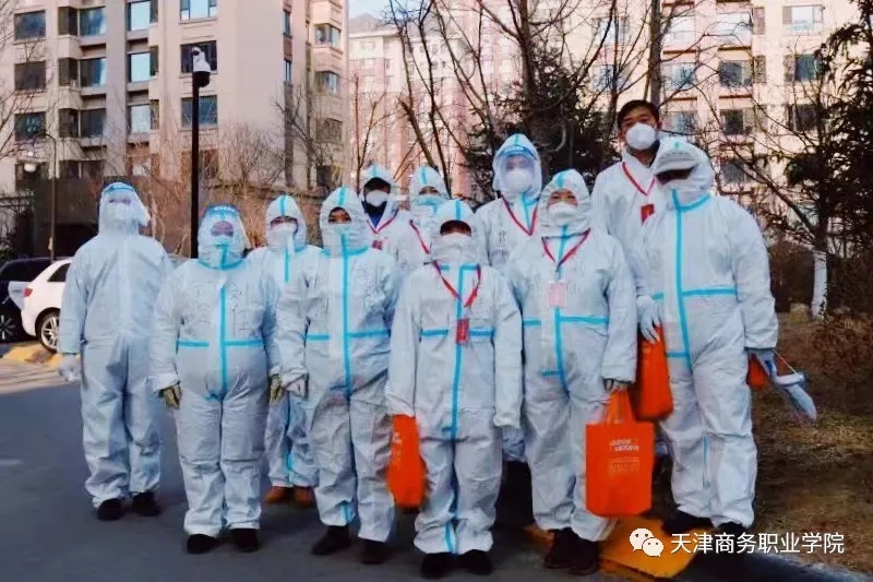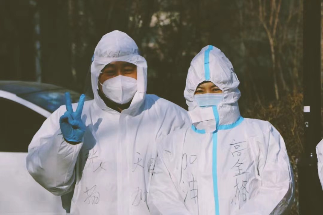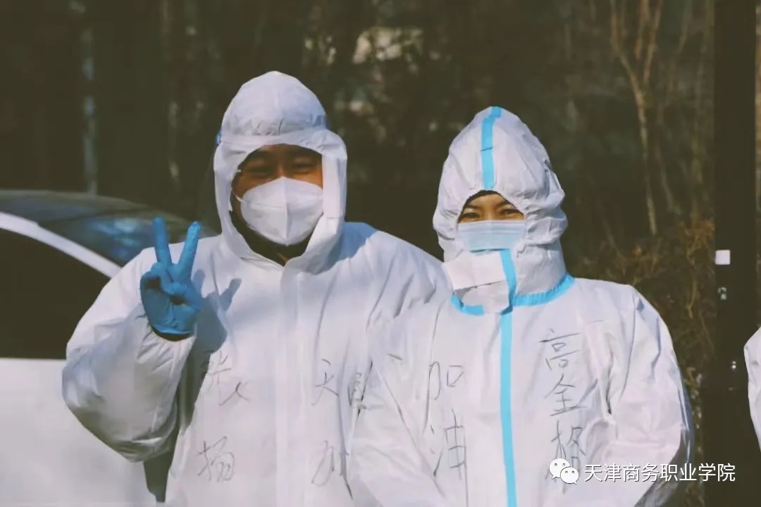 來自天津商務職業學院的教師高金格,剛剛結束一個學期的教學工作,原本可以在家休息幾天,她卻和丈夫一起投身了小區的抗疫工作,兩人身穿防護服,雖然看不太清對方的臉,卻不由相視一笑。
