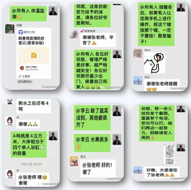 社區領導考慮到張援越老師曾經做過心臟支架手術,就安排張老師作為網格員負責社區居民信息統計、各微信群的聯絡、信息發布及居民情緒安撫工作。突發的疫情使不少居民情緒緊張,張援越老師總是準確把握政策尺度,以陽光的心態、幽默、通俗的文字,在社區各個群里為大家排憂解難,協助居民購水、購藥,通知核酸時間,使所在群里的居民情緒逐漸穩定,理性面對發生的一切。