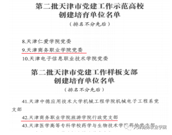 近日,市委教育工委市教委公布了第二批新時代天津市高校黨建“領航工程”創建培育單位名單,我校黨委入選天津市黨建工作示范高校創建培育單位,旅游學院行政黨支部入選天津市黨建工作樣板支部創建培育單位。