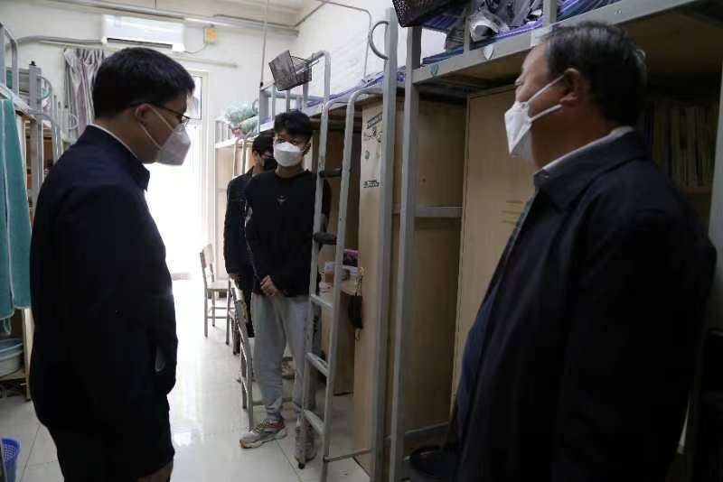 市商務局領導充分肯定了學校疫情防控及返校復課的工作落實情況,他強調,學校屬于人員密集區,可能成為“放大鏡”,務必要盯緊“人、物、環境”,守好校園關口。做好人員管控要求,筑牢外包服務人員“防疫墻”;凡進入學校的快遞、行李、餐飲食材等物品嚴格按照規范和程序進行消殺;要加強教室、食堂、宿舍這些學生經常活動聚集場所的環境衛生,對高頻接觸的物體表面要提升消毒頻次、清潔頻次,加強通風換氣。返校復課后,學校要嚴格落實疫情防控工作方案和應急處置預案,明確學校領導班子、校長、教師等各方面責任,搞好實戰演練,備齊備全物資,科學組織教學活動,確保防疫到位、安全到位。