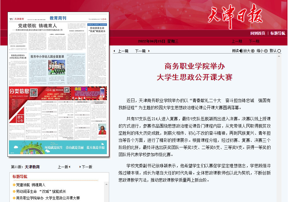 媒體關注 | 天津日報報道我校大學生思政公開課大賽舉辦情況