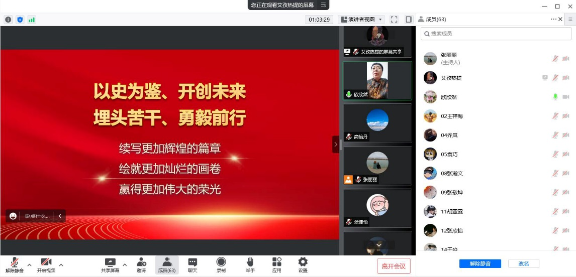 6月13日,劉欣校長通過騰訊會議在線上為其聯系班級旅游管理專業2001班學生講授了一堂精彩的形勢與政策課,隨后劉欣校長通過騰訊會議參加了該班主題班會,并在該班班會結束后主持召開了學生座談會。在此之前,劉欣校長深入學生宿舍詳細了解了學生的思想狀況和學習生活情況,并與學生代表共進午餐,為學生答疑解惑。講座中,劉欣校長以“百年奮斗謀復興,勇毅前行興偉業”為題,分四個部分為同學們進行了極富感染力的深入講解。在講座結束時,劉欣校長強調:一要以史為鑒,開創未來;二要埋頭苦干,勇毅前行,繪就更加燦爛的畫卷。講座結束后,同學們紛紛表示,劉校長的講解內涵深刻、內容豐富、情感真摯,自己獲益匪淺,并表示要堅定不移聽黨話、跟黨走,刻苦學習,頑強拼搏,勇于實踐,努力使自己成為擔當民族復興大任的時代新人。