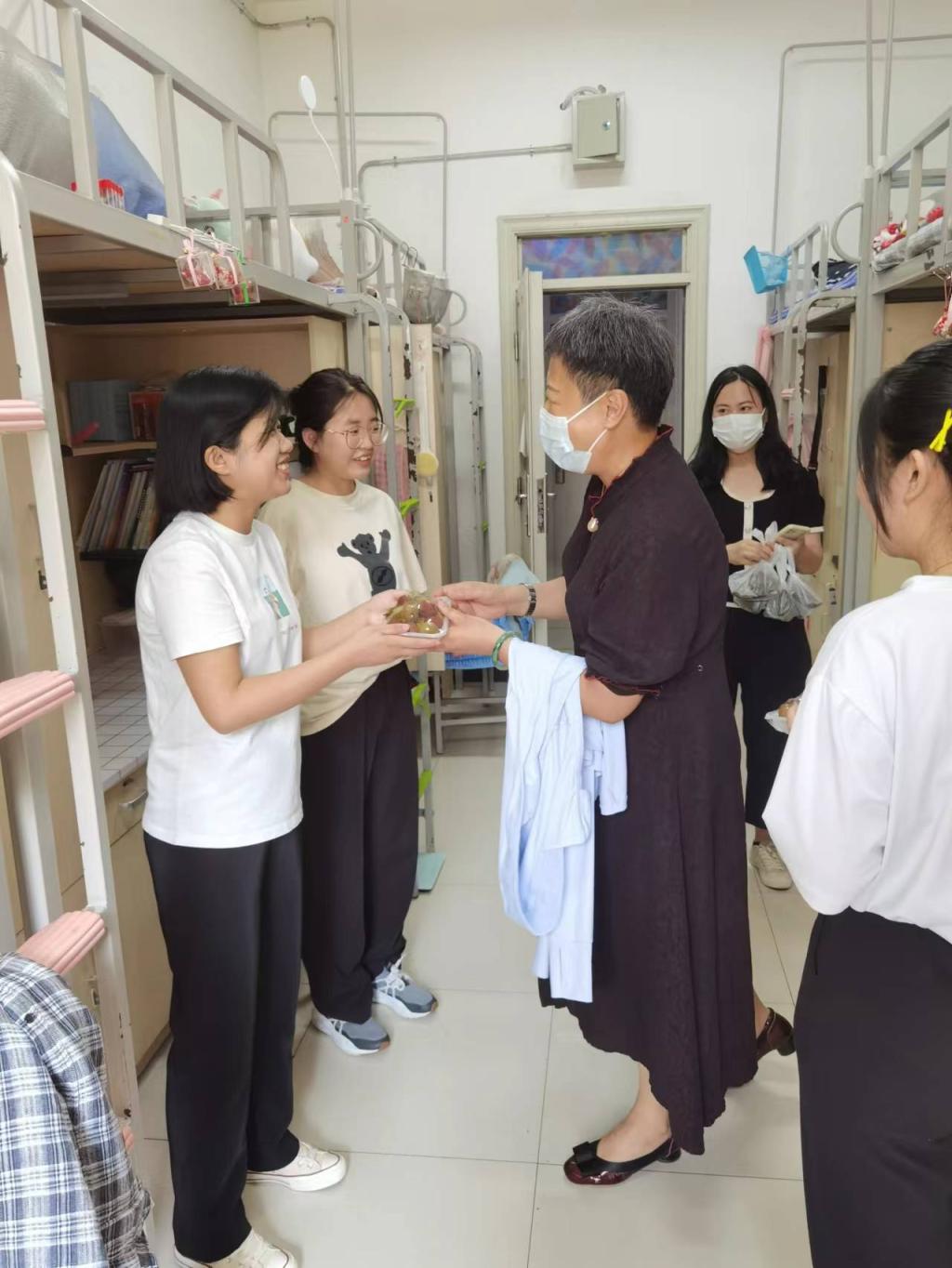 在此之前,劉欣校長與學生代表共進午餐,親切詢問了同學們的學習情況以及同學們的生活情況,就教育教學、疫情防控和學生身心健康等進行了細致交流,并結合自己的經歷給予學生建議與指導。用餐結束后,劉欣校長深入5號學生公寓,仔細查看了學生在公寓內的生活情況,并給同學們帶來愛心水果,對同學們的宿舍狀況給予了表揚,同時勉勵同學們努力學習,切實做到德智體美勞全面發展。