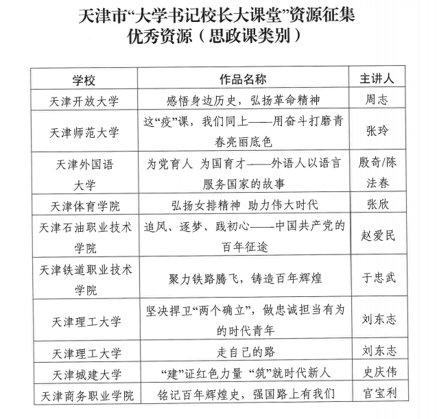 6月23日,市委教育工委、市教委公布天津市首次“大學書記校長大課堂”相關資源評審結果。天津商務職業學院黨委書記宮寶利所講題為《銘記百年輝煌史,強國路上有我們》的思政課被評為優秀資源。
