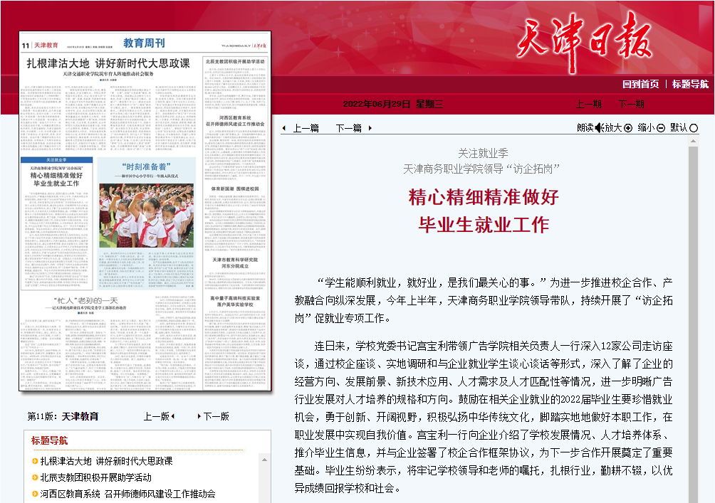 媒體關注 | 《天津日報》報道我校領導“訪企拓崗” 精心精細精準做好畢業生就業工作