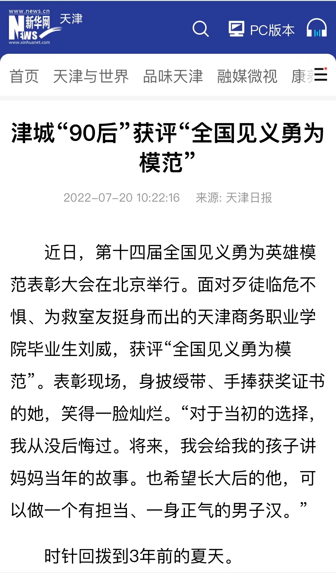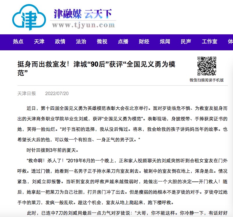 媒體關注 | 天津日報、央廣網、新華網、光明網、澎湃、北方網、今晚報、每日新報等媒體 報道我校畢業生劉威獲評“全國見義勇為模范”