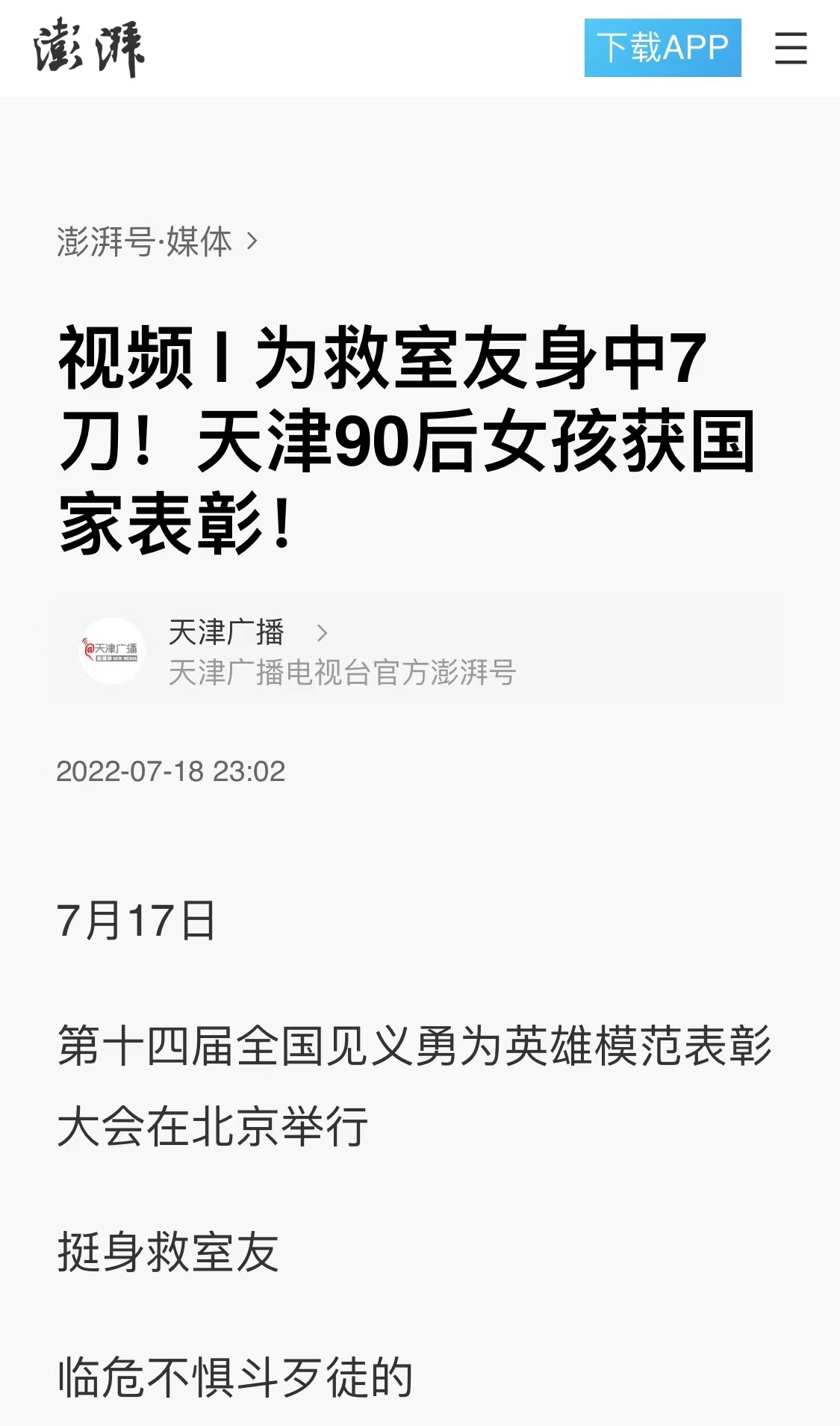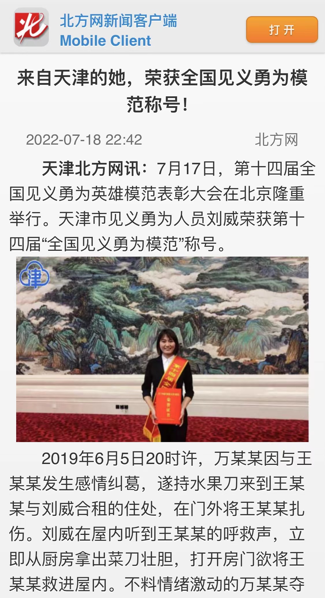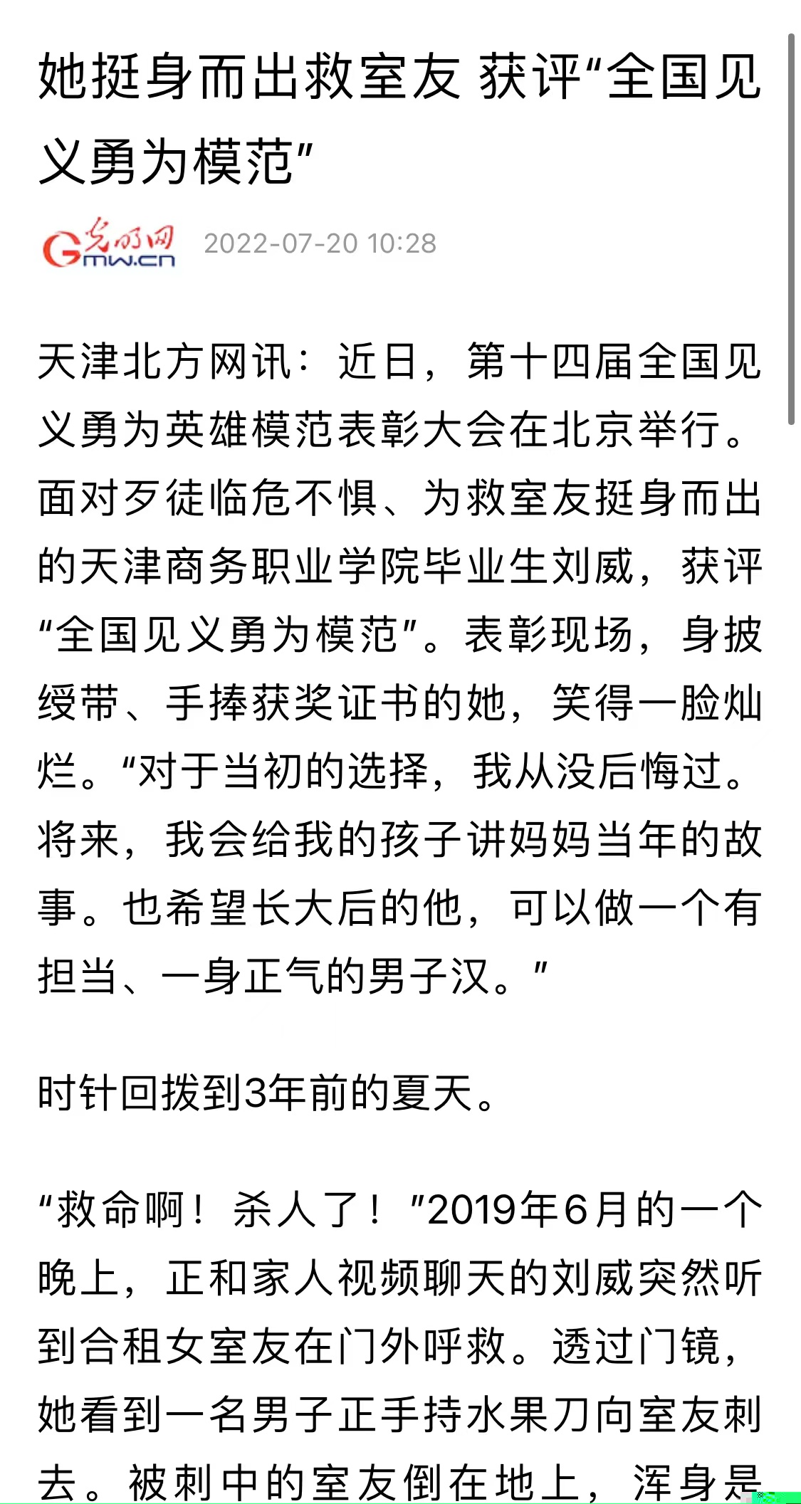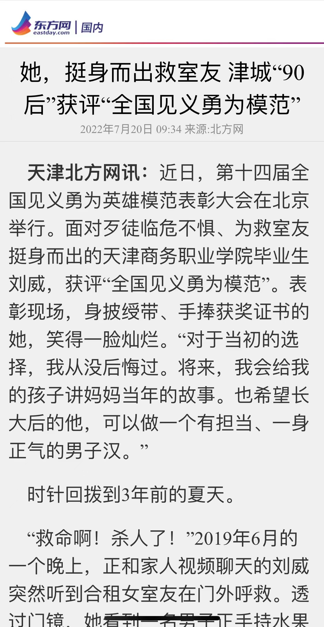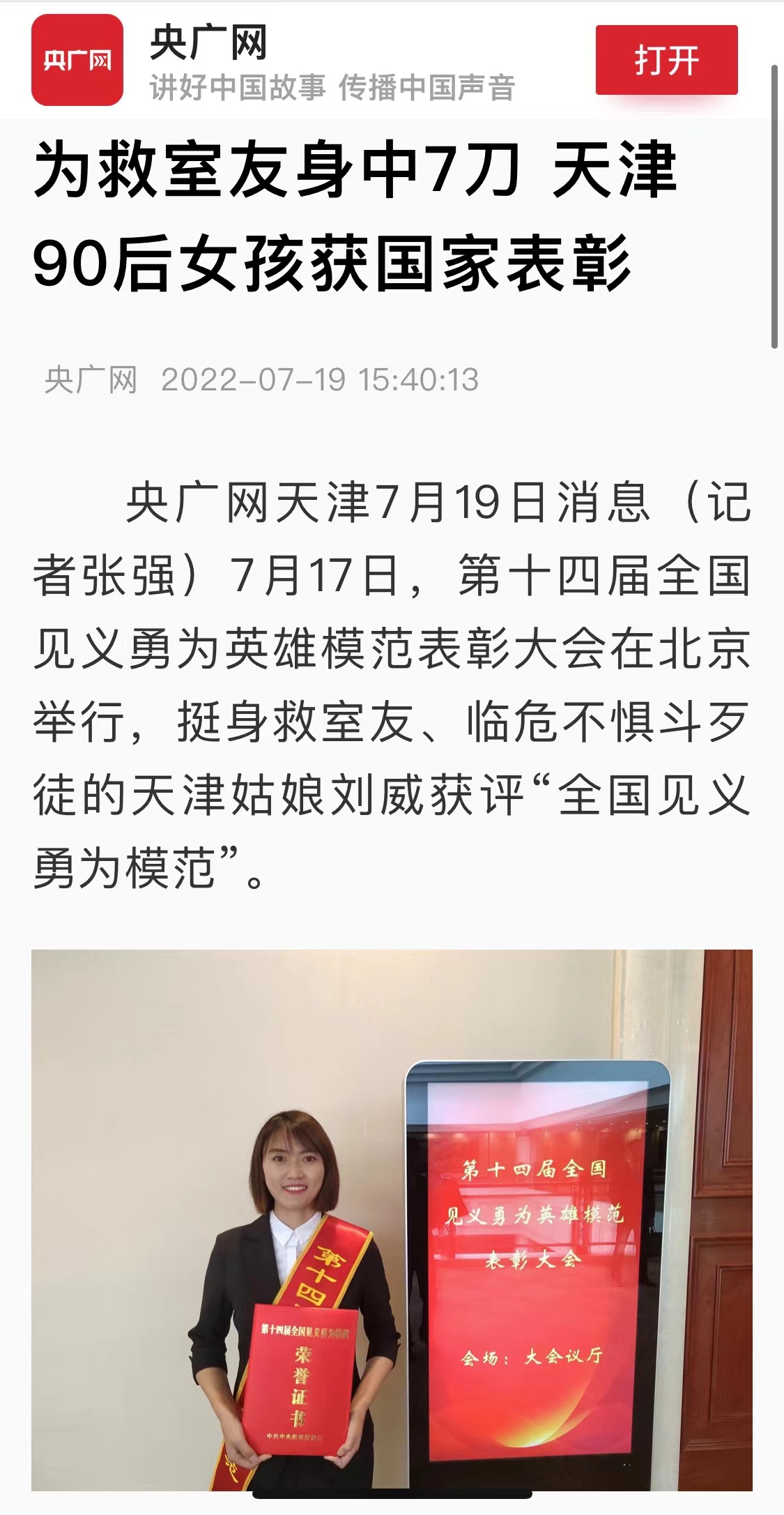 央廣網天津7月19日消息(記者張強)7月17日,第十四屆全國見義勇為英雄模范表彰大會在北京舉行,挺身救室友、臨危不懼斗歹徒的天津姑娘劉威獲評“全國見義勇為模范”。