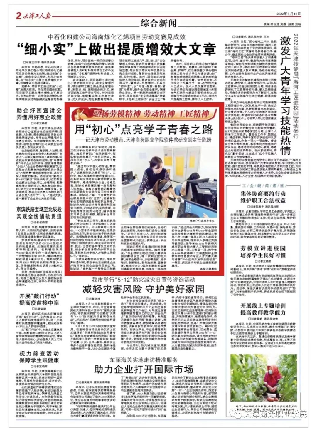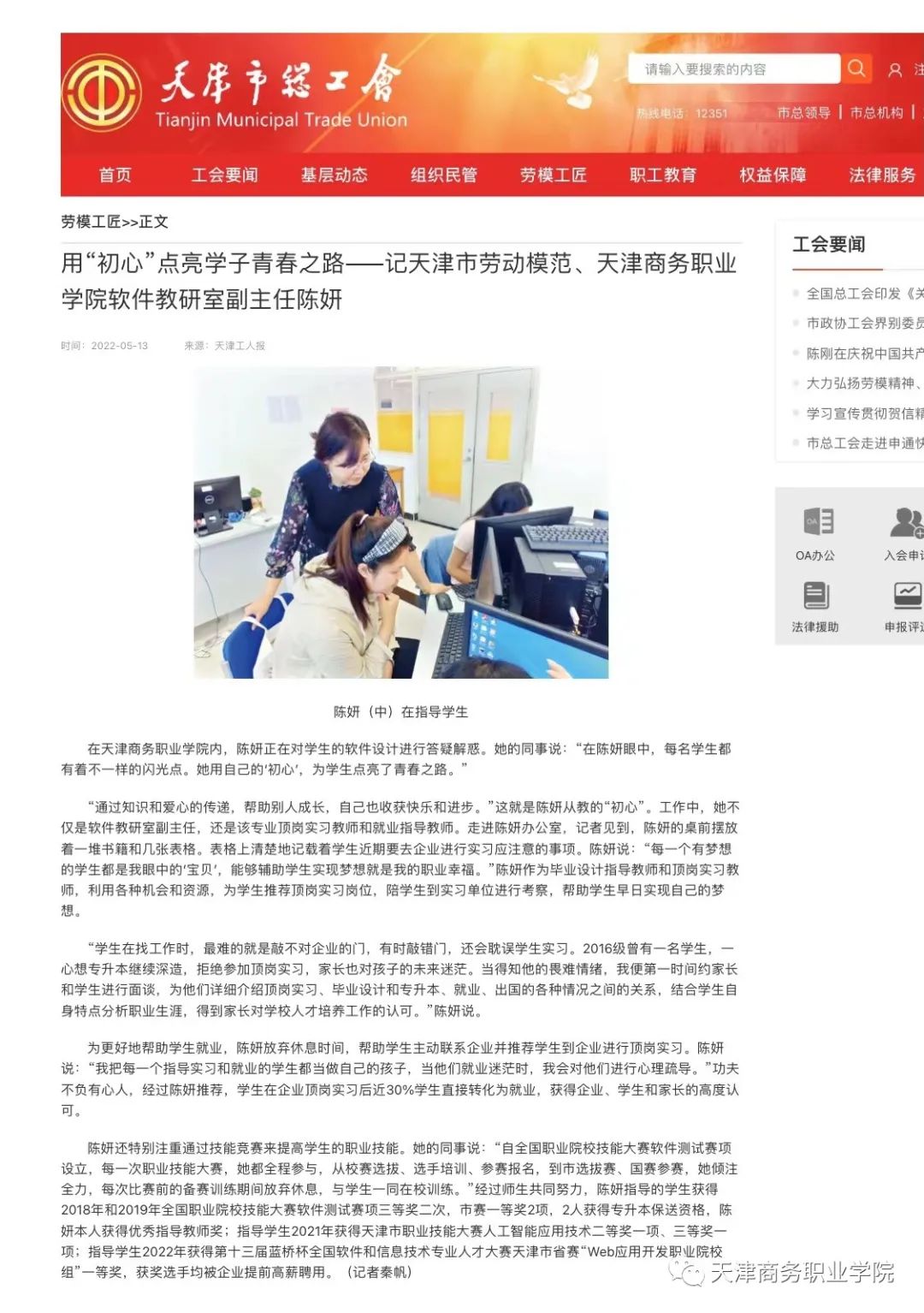 天津市總工會官網在“勞模工匠”板塊轉發《用“初心”點亮學子青春之路——記天津市勞動模范、天津商務職業學院軟件教研室副主任陳妍》一文。