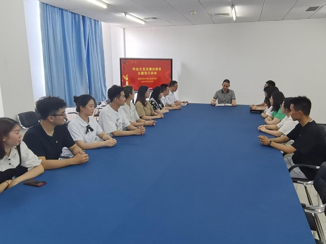 為全面貫徹落實黨的二十大精神,扎實開展學習貫徹習近平新時代中國特色社會主義思想主題教育,不斷推進廉潔文化建設,切實做好畢業(yè)季離校教育,涵養(yǎng)清廉學風、校風和家風,6月16日,國際貿(mào)易學院行政黨支部開展畢業(yè)生預備黨員廉潔教育主題黨日活動。