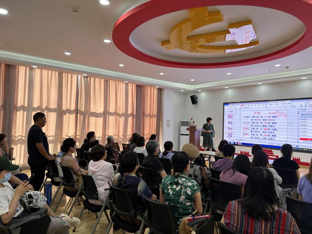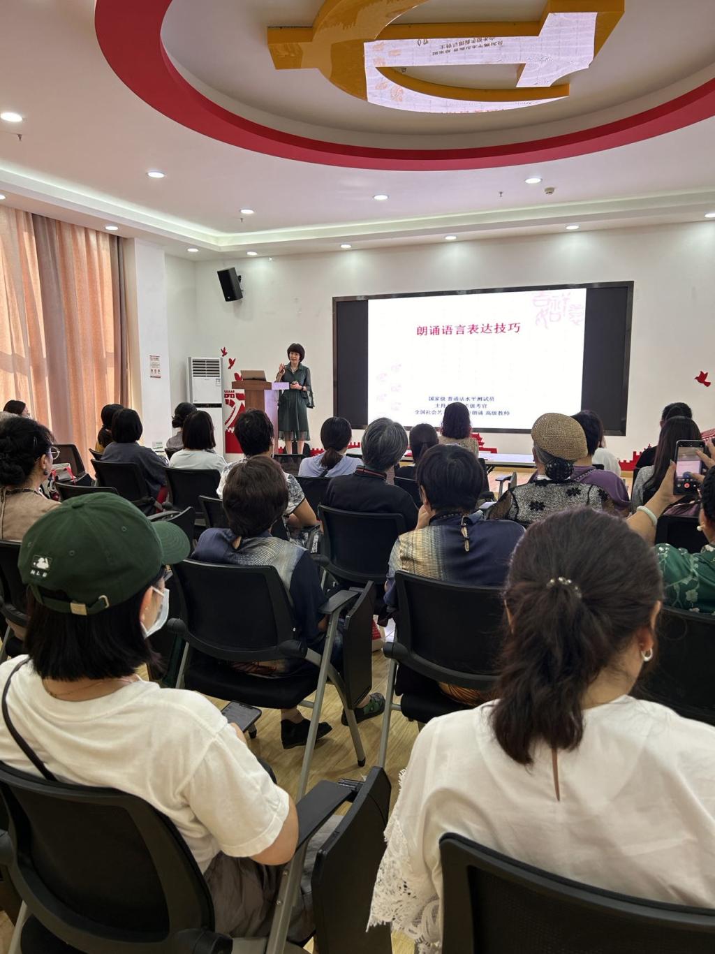活動中,測試站特聘國測員李梅老師向社區居民講解了什么是普通話,普通話的意義以及朗誦技巧和規范,提倡大家在日常生活中養成說普通話的習慣,提升規范使用國家通用語言文字的意識和水平。并且深入淺出的從朗誦的定義、意義、階段、要素等幾個方面結合自身演繹為大家示范,現場反響熱烈,受到社區居民的高度評價。