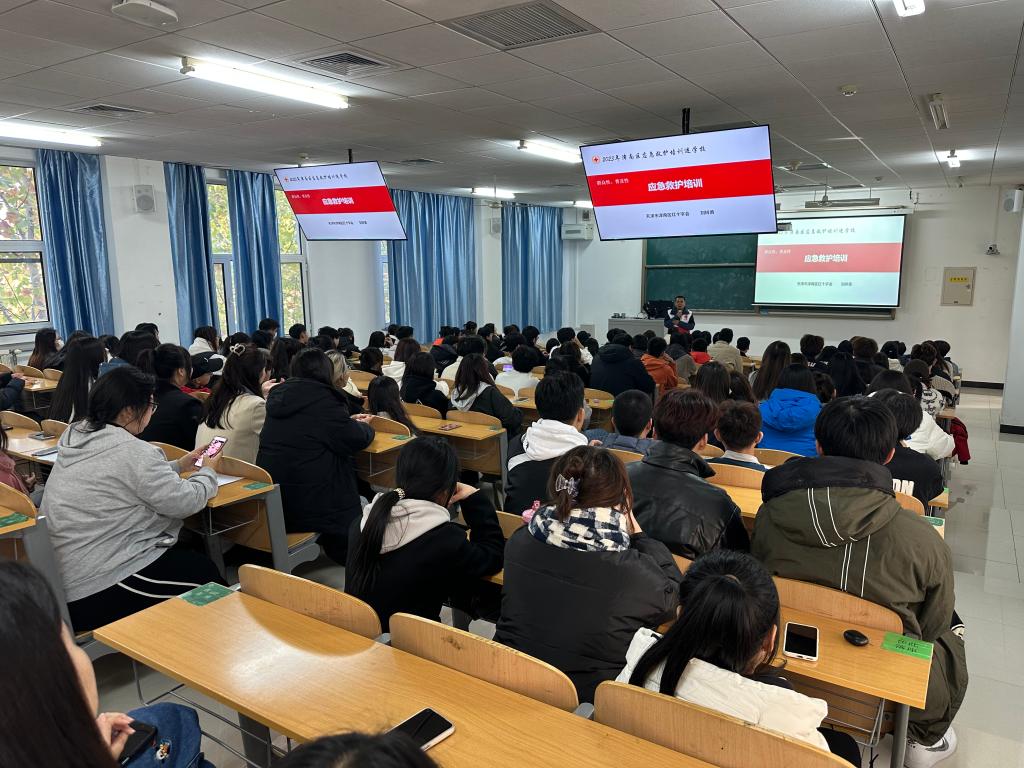 為深入貫徹落實黨的二十大精神,深入推進落實市委、市政府《關于推進健康天津建設的實施意見》(津黨發[2016]34 號)和《教育部等五部門關于全面加強和改進新時代學校衛生與健康教育工作的意見》(教體藝〔2021〕7號)精神,按照市教委《天津市公眾心肺復蘇急救科普進校園活動實施方案》的要求,進一步普及應急救護知識,提高師生自救互救意識與能力,我校后勤管理處醫務室于11月14日聯合津南區紅十字會組織開展“應急救護培訓進校園”活動。校團委在此次活動中給予全力配合,組織校紅十字會成員、各類社團成員及各二級學院學生代表共150余人積極參加此次活動,現場座無虛席,活動收效明顯。