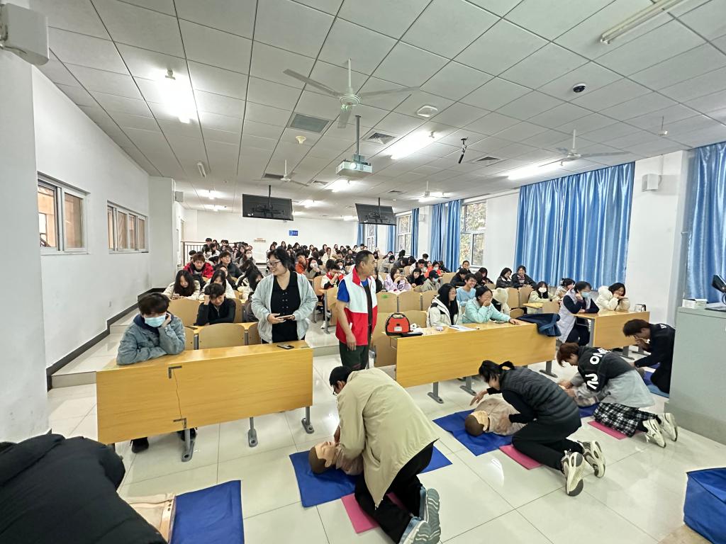 為了讓師生們更直觀掌握心肺復蘇要領,紅十字會醫護人員與同學們利用模擬人在現場與師生們開展心肺復蘇實操演練,手把手進行急救手法和注意事項的教學。課上紅十字會的醫護人員以學生為主體,首先引導同學們認識到心肺復蘇的重要性,使學生了解如何能在黃金四分鐘內對心跳呼吸驟停患者有效實施心肺復蘇,為患者爭取進一步搶救的時間,極大的挽救患者生命。通過心肺復蘇的理論講解和實際操作指導,使學生們了解了心肺復蘇原理,掌握了操作方法,規范了操作流程,部分同學上臺參加了心肺復蘇的實踐操作練習。在課程深化環節為學生們講解了自動體外除顫儀的使用方法,使學生們了解到自動體外除顫儀和心肺復蘇搭配操作能夠明顯提升搶救成功率。學生們興趣濃厚,練習很認真,收獲頗豐。